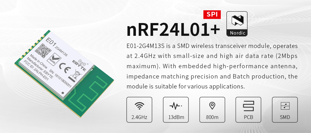 RF Parameter Value Remark Working frequency 2400~2525 MHz Support ISM band Transmitting power 13 dBm Max. Power (20mW) Receiving sensitivity -98 dBm Air data rate is 250 kbps Air data rate 250k~2Mbps Controlled via user's programming Test distance 800m Test condition:clear and open area, antenna gain: 5dBi,antenna height: 2.5m,air data rate: 250kbps Hardware Parameter Value Remark Size 14 * 23 mm PCB antenna included Antenna type PCB 50 ohm impedance Communication interface SPI 0-10Mbps Package SMD Electronic parameter Min. Typ. Max. Unit Condition Power supply 2 3.3 3.6 V ≥3.3 V ensures output power Communication level - 3.3 - V For 5V TTL, it may be at risk of burning down Transmitting current - 38 - mA Instant power consumption Receiving current - 16.8 - mA Sleep current - 1.2 - μA Software is shut down Operating temperature -40 20 85 ℃ Operating humidity 10 60 90 % Storage temperature -40 20 125 ℃