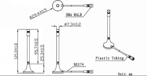 Frequency Range : 698~868/1850~2655MHz Polarization : Linear Gain : 2dBi(Zenith) V.S.W.R : <2.0 Impendance : 50Ω Cable : RG174 / 3m Connector : SMA / Male Mounting Method : Magnet Operating Temperature : -40℃~+85℃ Vibration : 10 to 55Hz with 1.5mm amplitude 2hours Environmentally Friendly : ROHS Compliant