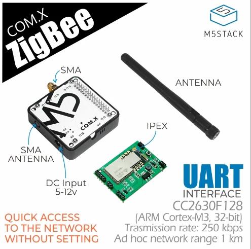 COM.Zigbee is a Zigbee self-organizing network communication module launched by M5Stack. The module adopts the CC2630F128 solution, internally integrates the Zigbee protocol stack, and opens the serial communication interface. Integrated external antenna, single node stable communication distance up to 1km, 200-level router depth, through the MESH networking mode, you can extend your IoT application in a wide range, with both ultra-low power consumption and high sensitivity. The Zigbee network can support hundreds of nodes and has enhanced security features. It can provide complete and interoperable IoT solutions for home and building automation.