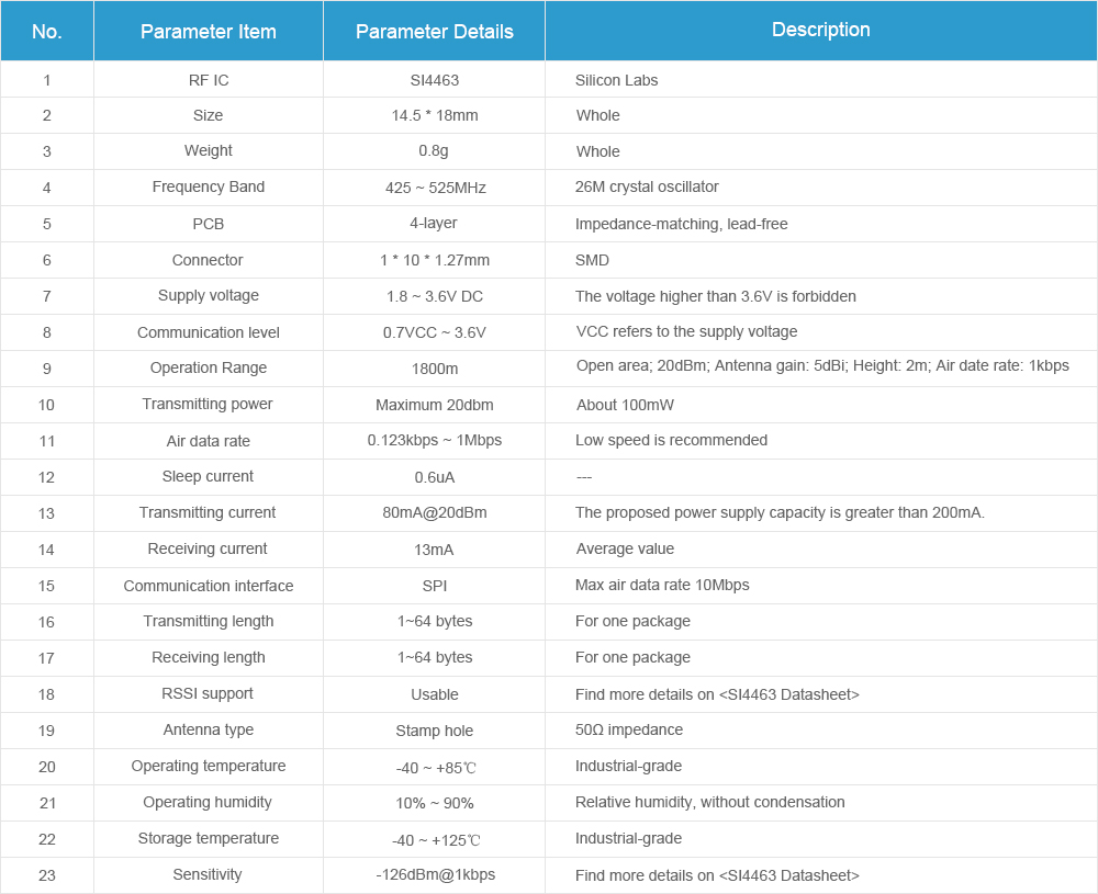 [Interface] : SPIE10-433MS is based on original imported RF SI4463 form Silicon Labs in USA. Module features stable performance, long transmitting distance and strong penetration and diffraction ability.