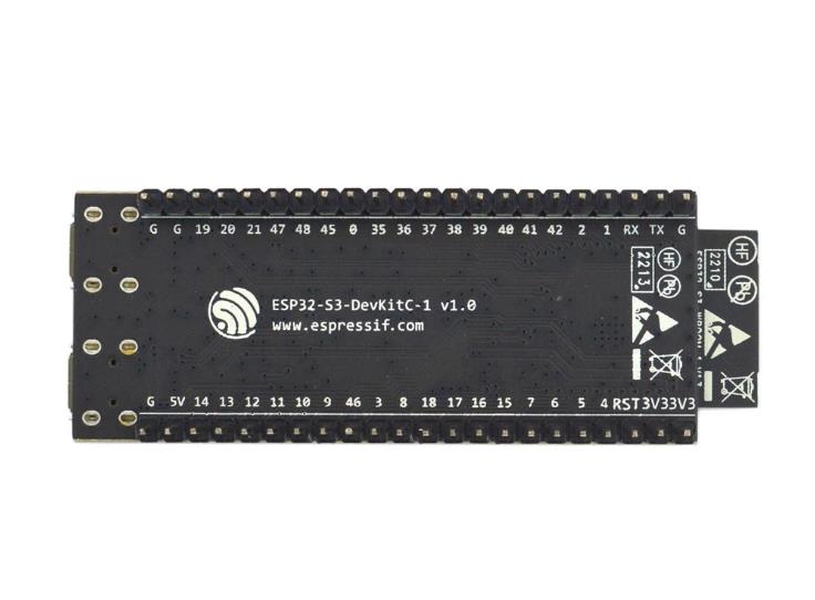 The ESP32-S3-DevKitC-1 is an entry-level development board equipped with ESP32-S3-WROOM-1, a general-purpose Wi-Fi + Bluetooth® LE MCU module that integrates complete Wi-Fi and Bluetooth LE functions. Most of the I/O pins on the module are broken out to the pin headers on both sides of this board for easy interfacing. Developers can either connect peripherals with jumper wires or mount ESP32-S3-DevKitC-1 on a breadboard.