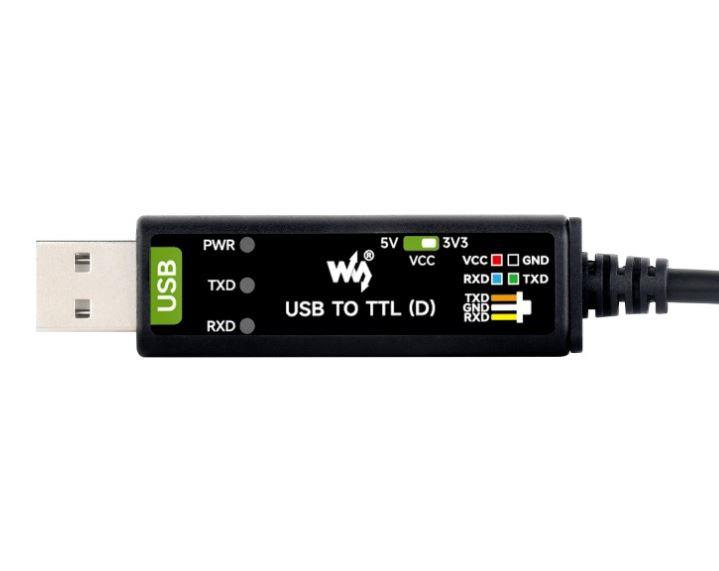 SpecificationsProduct category Industrial USB TO TTL serial cable Chip scheme FTDI original FT232RNL Host port USB Data rate 300bps ~ 3Mbps Device Port UART USB port Connector: USB-A Protection: self-recovery fuse, ESD protection UART port Connector: separated 4pin female header + SH1.0 3PIN fool-proof connector Protection: IO protection diode Indicator PWR: power indicator, turns on when there is USB connection and voltage is detected TXD: TX indicator, turns on while the USB port is sending data RXD: RX indicator, turns on while the device port is sending data back Cable Black, PVC sheath, total length 1m