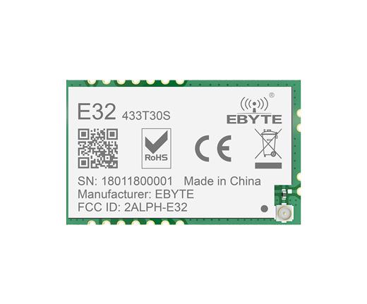 RF Parameter Value Remark Working frequency 410~441 MHz Default: 433MHz Transmitting power 21~30 dBm Default: 30dBm(About 1W) Receiving sensitivity -147 dBm Air data rate: 0.3kbps Air data rate 0.3k~19.2kbps Default: 2.4kbps Test distance 8000 meter In open and clear air, with maximum power, 5dBi antenna gain, height of 2m, air data rate: 2.4kbps Hardware Parameter Value Remark Size 25 * 40.3 mm Antenna type IPX/Stamp hole Communication interface UART Baud rate: 1200~115200, default: 9600 Package SMD Buffer 512 bytes buffer Automatically sub-packaging with 58 bytes per package Electronic parameter Min. Typ. Max. Unit Condition Power supply 3.3 5 5.2 V Communication level 2.5 3.3 3.6 V Transmitting current 520 550 610 mA 30dBm(1W) Receiving current 22 23 25 mA Sleep current 4 5 6 μA Operating temperature -40 20 85 ℃ Operating humidity 10 60 90 % Storage temperature -40 20 125 ℃