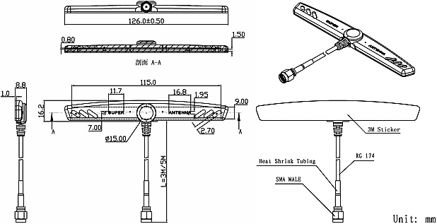 Frequency Range : 698~960/1710~2655MHz Polarization : Linear Gain : 2.5dBi(Zenith) V.S.W.R : <2.5 Impendance : 50Ω PCB Dimension : 115*9*0.8mm Cable : RG174 / 3m Connector : SMA / Male Radome Material : EVA Mounting Method : Adhesive Operating Temperature : -40℃~+85℃ Relative Humidity : Up to 95% Ingress Protection : IP67 Vibration : 10 to 55Hz with 1.5mm amplitude 2hours Environmentally Friendly : ROHS Compliant