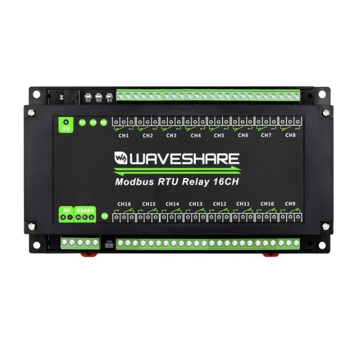 This product is an industrial 16-ch relay module controlled via RS485 bus, adopts Modbus RTU protocol, built-in protection circuits such as power supply isolation, ADI magnetical isolation, resettable fuse, and TVS diode, etc. It also comes with an ABS case.
