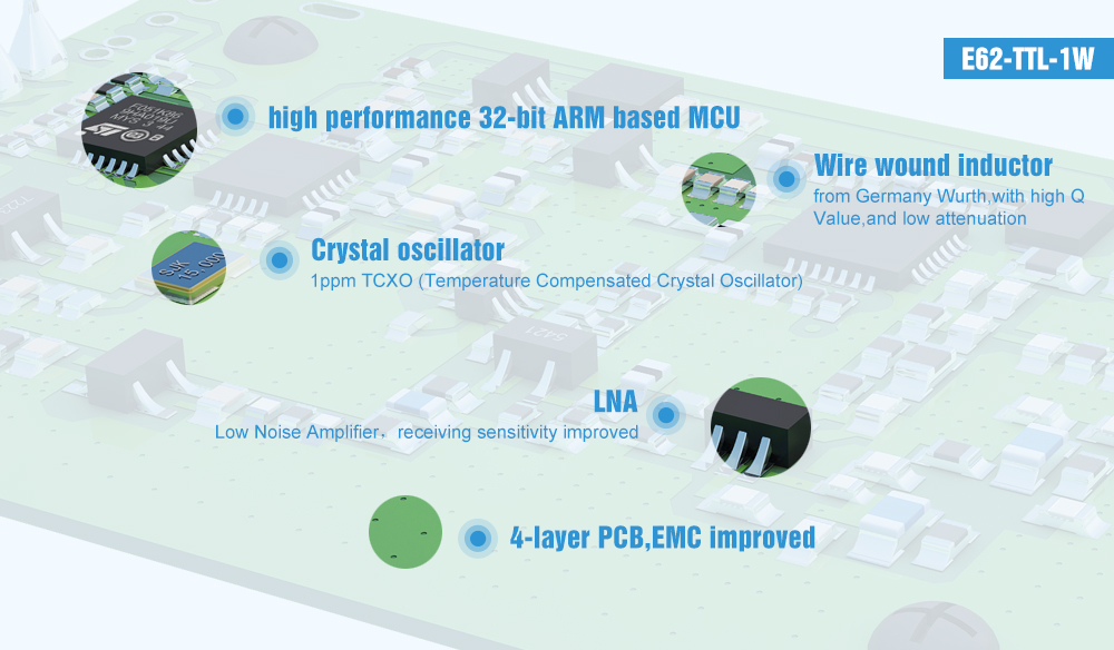 [Introduction] : E62-433T30D is a 1W wireless transceiver module,operating at 425-450MHz.It featues FHSS,which greatly improves the anti-interference performance, TDD,which realizes transmiting data while receiving simultanuously,and FEC algorithm, which ensures its high coding efficiency & good correction performance.