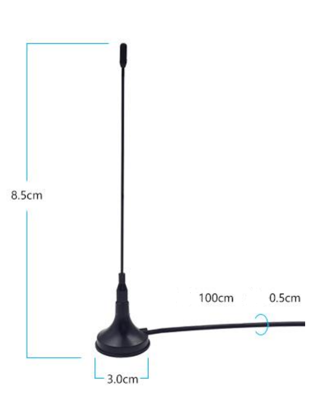 Frequency Range : 433 MHz Gain : 3.5dBi V.S.W.R : <1,5 Impendance : 50Ω Cable : RG174 / 1m Connector : SMA/J Mounting Method : Magnet Operating Temperature : -40℃~+85℃ Relative Humidity : Up to 95% Ingress Protection : IP67