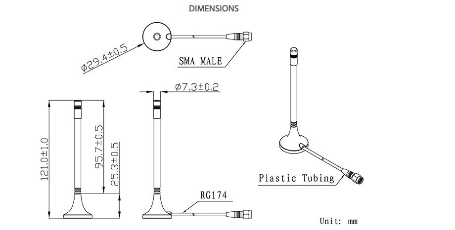 Item Specifications Antenna Frequency Range 2400~2483.5MHz Polarization Linear Gain(Zenith) 2.0dBi V.S.W.R(min) <2.0 Impedance 50Ω Mechanical Cable RG174 Connector SMA or others Mounting Method Magnet Environmental Operating Temperature -40℃~+85℃ Vibration 10 to 55Hz with 1.5mm amplitude 2hours Environmentally Friendly ROHS Compliant